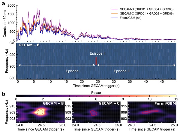 该伽马暴极为明亮,导致国际上一些观测设备发生仪器效应而无法进行精确测量。基于针对亮暴的创新设计,极目卫星克服了极端亮度的挑战,成功对该伽马暴进行了精确观测。在本项工作中,研究团队利用极目B卫星观测的高时间分辨率数据进行了深入分析,在爆发后约24秒处,发现一段中心频率为909赫兹、频率高度稳定且仅持续160毫秒的准周期振荡信号。研究团队还利用极目C空间望远镜(简称GECAM-C)和国际上的费米卫星(Fermi/GBM)的观测数据进行了交叉验证,佐证了该信号的真实性。