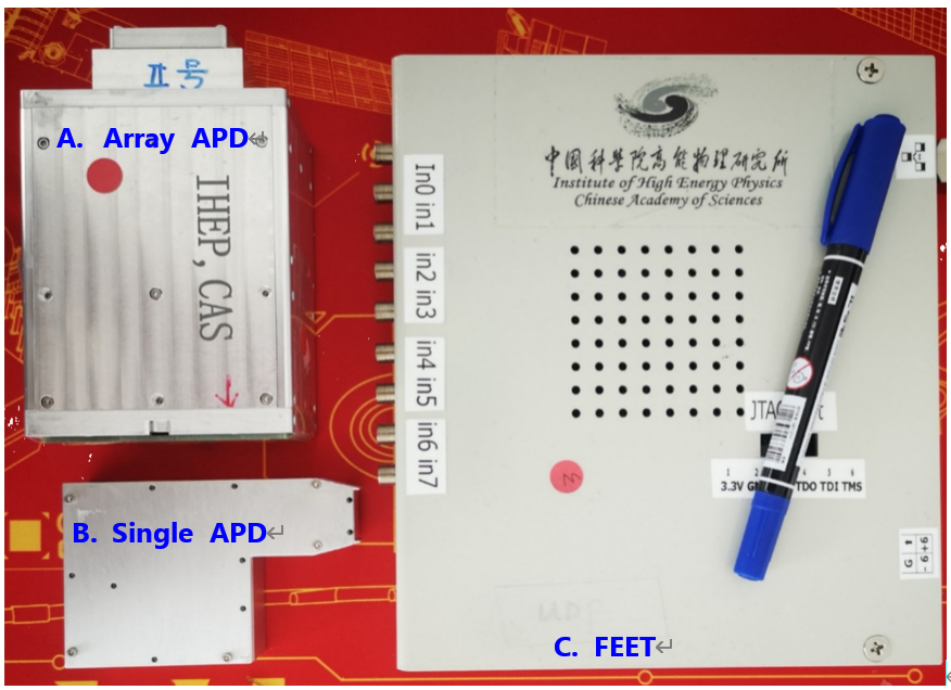 HEPS-ID33 (A)阵列型APD探测器; (B)单元APD探测器;(C)八通道读出电子学。