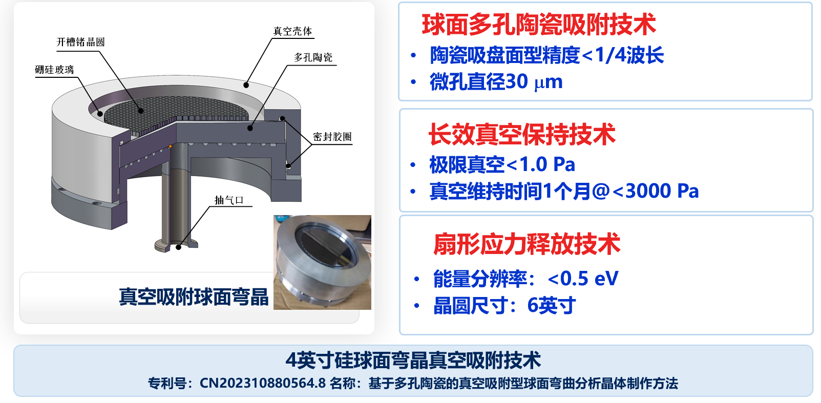 除此之外,ID33研究人员利用平切像素技术和多孔陶瓷真空吸附技术,研制了无气膜真空自吸附型晶体分析器。相较于上述阳极键合技术,其具有可灵活更换晶向,可变面型,以及真空自维持(维持周期大于一月)的优势。该技术也已申请专利,并获得国家重点研发项目的进一步资助,以发展和推广此类光学元件。