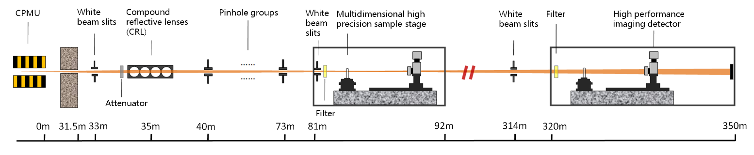 CPMU,IAW和芒果扭摆器三个插入件光源切换使用,粉光能谱范围5keV-300 keV,单色光能谱范围40keV-200keV,为各类样品的无损3D成像提供最佳X射线能量。最大物源距离330m,SRX的空间相干性高,光源对样品的点扩展函数小,样品处的光斑大。光斑横向尺寸从0.01mm到300mm可变,空间分辨率从0.5μm到50μm可变。采用滤光片、复合折射透镜和压弯可调劳厄双晶单色器等高稳定性宽带宽单色器,提供高稳定、高通量、高均匀、高相干、宽能谱范围的多尺度光斑。