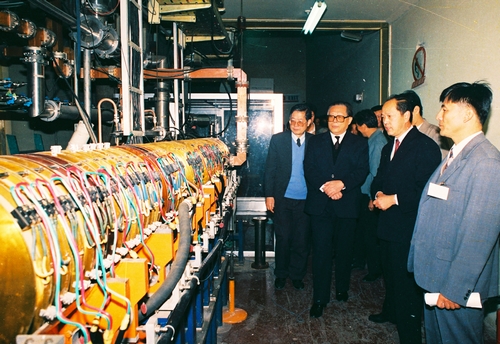 1988年10月24日,邓小平等党和国家领导人视察北京正负电子对撞机,慰问参加工程建设的代表。邓小平同志发表了“中国必须在世界高科技领域占有一席之地”的重要讲话。