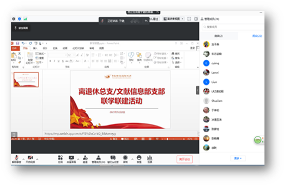 12月2日,文献信息部党支部与离退休党总支开展联学共建暨“我为群众办实事”主题党日活动。活动采取线上线下相结合的方式开展,由文献信息部党支部书记于健和离退休党总支副书记陈进共同主持,分别在图书馆和阅览室开设线下会场,20余名离退休党员代表通过线上参加。