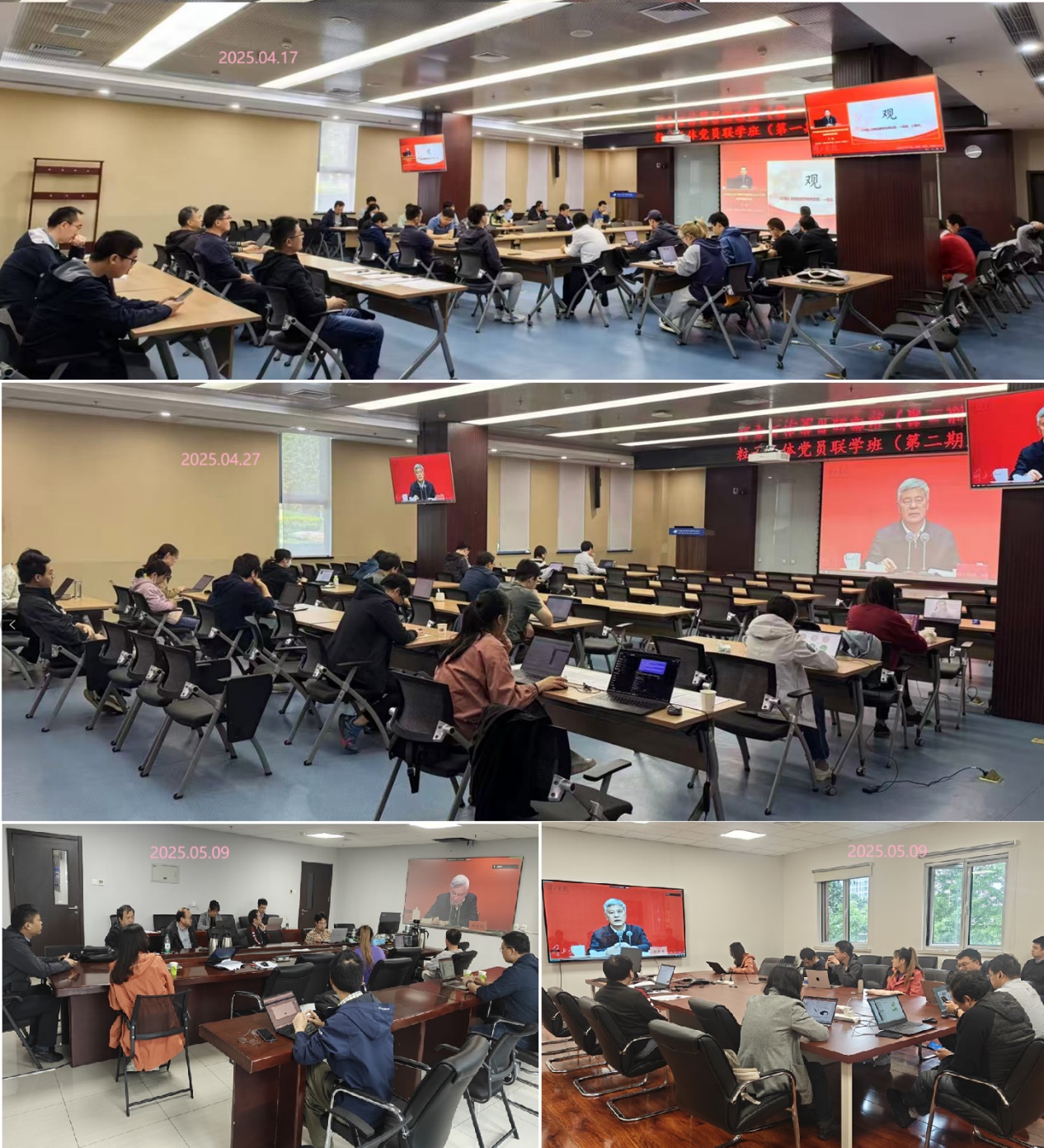 根据院党组和所党委的工作安排,粒子天体中心党总支分别于2025年4月17日、4月27日和5月9日三天,在多学科大楼124会议室、312会议室和天体楼三楼会议室组织全体党员参加习近平新时代中国特色社会主义思想专题培训党员联学班主题学习,学习内容包括了《牢牢把握习近平新时代中国特色社会主义思想的世界观和方法论》、《深入学习贯彻习近平总书记关于科技创新的重要论述 在科技强国建设伟业中再立新功》、《深入学习领会习近平新时代中国特色社会主义思想》和《中国共产党百年奋斗的历史经验》四个视频报告。