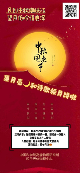 中秋国庆佳节来临之际,为丰富中心青年学生的文化生活,营造浓厚的节日氛围,天体团总支举办摄影活动。同学们拍摄了高能所园区的月亮美景并赋诗词,多名同学的原创诗歌体现了中心青年对美好生活的祈愿,对祖国繁荣昌盛的祝福。同时中心也为大家准备了爱心月饼,乐享节日的喜庆。