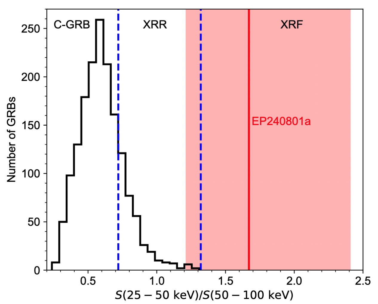 Figure 3: Comparison of EP240801a to Fermi GRBs. The histogram shows the distribution of the fluence ratio S(25 − 50 keV)/S(50 − 100 keV) for 1647 Fermi GRBs. The red line represents the fluence ratio of EP240801a, and the shadow is the 1σ uncertainty interval. The blue dashed lines represent the boundaries of Classical GRBs (C-GRBs), X-Ray-Rich GRBs (XRRs), and X-Ray Flashes (XRFs) described by Sakamoto et al. (2008).