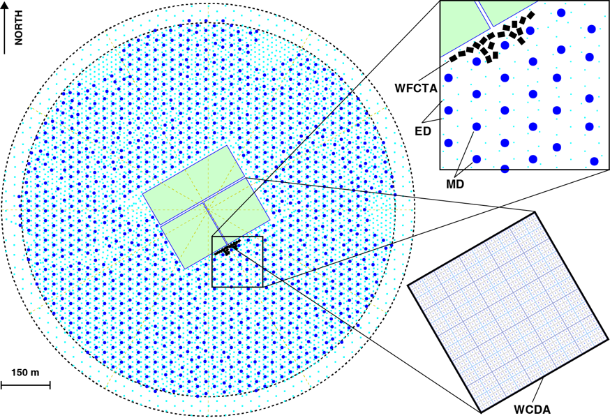 WFCTA (Wide Field-of-View Cherenkov Telescope Array):18 telescopes that observe the faint ultraviolet Cherenkov light emitted by air showers in the atmosphere.