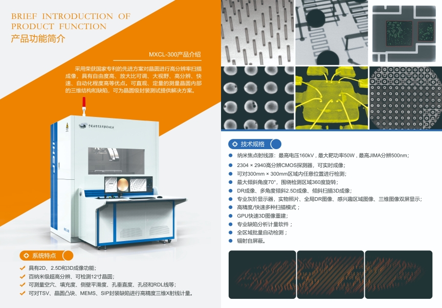 X射线三维层析成像仪(MXCL-300)作为技术成果转化的重要仪器设备之一,极大解决了半导体工业生产中大尺寸板状物的检测问题,集自由度高、放大比可调、大视野、高分辨、快速重建等优点于一身,在贴片电阻、晶圆级封装缺陷、球栅阵列封装(BGA)缺陷、方型扁平式封装(QFP)缺陷、绝缘栅双极型晶体管(IGBT)焊层缺陷检测、插件焊接质量等电路板、芯片、板状化石等领域发挥了极为重要的作用。