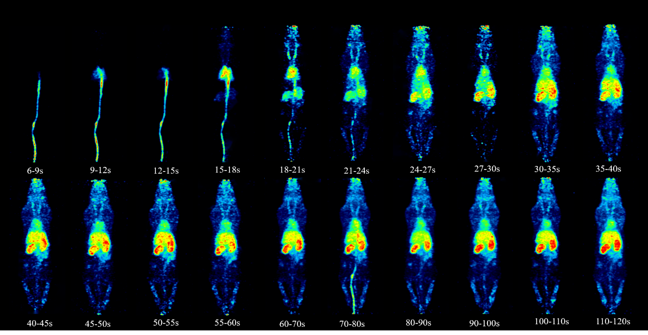 基于该设备成功实现了SD大鼠全身动态代谢成像(图2),成像结果清晰呈现了18F-FDG示踪剂从尾静脉注射后,经心脏循环至肝肾代谢的全过程,在单台设备上经单次扫描完成了大鼠多器官药代动力学连续监测。该技术突破为多靶点示踪成像、肿瘤转移机制研究及新药疗效评估提供了高精度研究平台,相关技术已申请国家发明专利3项。