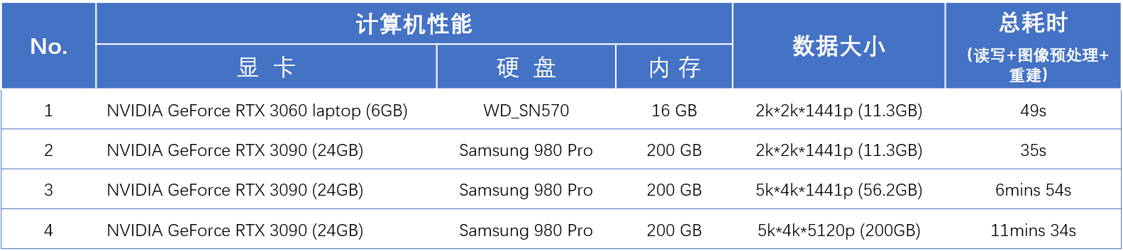 本软件算法使用CUDA软件库进行编写,其运行需要Turing、Ampere架构核心或更新的NVIDIA显卡/计算卡(显卡的核心架构可通过: https://www.techpowerup.com/gpu-specs/?mfgr=NVIDIA&sort=name 查询)。此外,为了满足本软件较高的重建速度,请尽量使用NVMe接口固态硬盘 SSD (如:WD:SN770/SN570、KBG40ZNS等)进行数据的读写。