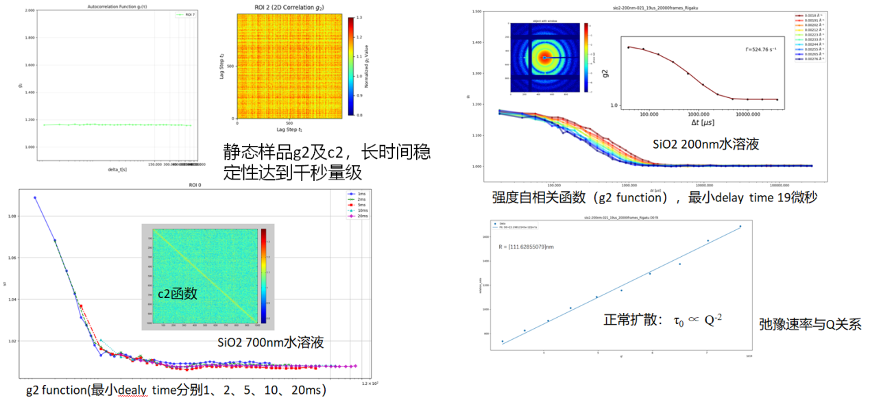 结合静态样品和SiO2纳米颗粒水溶液样品实验,SAXS XPCS实现1000s-20μs时间尺度动力学测量。