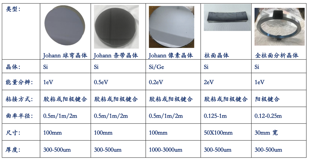 ID33自主研制了乾坤谱仪的全部晶体分析器,曲率半径涵盖0.5米-2米。晶体材料包括单晶硅、锗、铌酸锂和石英等。其类型包括eV能量分辨的球弯晶体和0.5eV的条带晶体,以及能量分辨约50meV的平切像素型分析晶体。