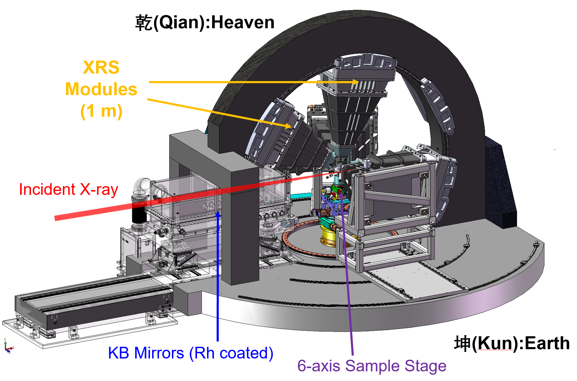 X射线拉曼散射(XRS)谱仪主要包含6个模组,每个模组内分析晶体采用3×5阵列排布,6个模组共90个分析晶体。其中垂直方向的模组位于拱桥上,三个模组分别向前散射,垂直散射和背散射三个位置。水平模组将位于向前散射方向的左右两侧,以及背散射的方向。其中向前散射的方向可以定在30°左右,以获得低动量转移(q~2.5Å-1, 10keV)的X射线拉曼散射谱,获得偶级近似的X射线吸收谱相似的谱学。而背散射模块则可以位于散射角位于165°之内,利用大角度的高动量转移(q~9.7 Å-1, 10keV),获得非偶级近似的非共振非弹性散射谱。
