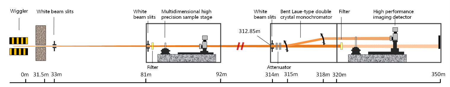 CPMU,IAW和芒果扭摆器三个插入件光源切换使用,粉光能谱范围5keV-300 keV,单色光能谱范围40keV-200keV,为各类样品的无损3D成像提供最佳X射线能量。最大物源距离330m,SRX的空间相干性高,光源对样品的点扩展函数小,样品处的光斑大。光斑横向尺寸从0.01mm到300mm可变,空间分辨率从0.5μm到50μm可变。采用滤光片、复合折射透镜和压弯可调劳厄双晶单色器等高稳定性宽带宽单色器,提供高稳定、高通量、高均匀、高相干、宽能谱范围的多尺度光斑。