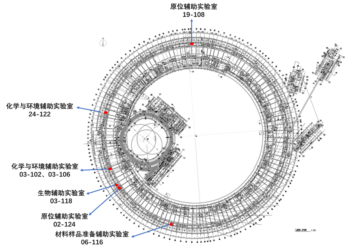 原位辅助实验室位于外圈内侧实验室19-108和03-124,用于空气环境下的原位设备调试和存储,包括调试平台、存储货架、电焊桌,真空干燥箱和通风橱等。外圈内侧实验室03-124中的一部分为万级洁净间,面积约十平米,可进行有洁净需求的操作。另外一部分进行简单的样品制备,配备了试剂柜,气瓶柜,通风橱等,为HEPS的原位实验提供支撑服务。