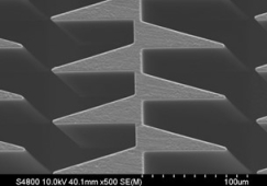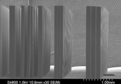 BSRF 光刻组的研究工作是以同步辐射光刻为核心,通过结合其它微加工手段开展多方位的MEMS 研究和应用,包括 LIGA 技术、 SU8 技术、 硅刻蚀技术等。 目前主要研究方向为 X 射线光学元件的研制, 研究内容包括金属光栅、折射聚焦透镜、波带片、 精密微金属结构系统等。图 4 为利用 1B3A 束线的 LIGA 技术制备出的金光栅照片, 最小线条宽度 2μ m, 厚度可达 90μ m。 图 5 为镍基高能 X 射线复合折射透镜, 适用于对大于 50keV 的 X 光进行聚焦,厚度可以实现大于 1mm。图 6 为 SU8 基 X 射线复合折射透镜, 适用于对小于 80keV 的 X 光进行聚焦,厚度可以实现大于 2mm。