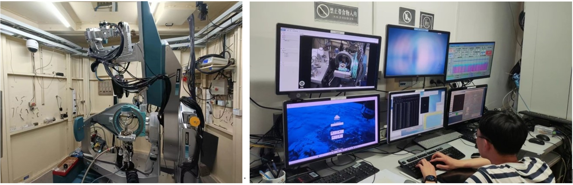 图1 低磁型6+3圆Huber衍射仪(左图),可开展所有扫描模式的X射线散射、衍射和反射以及偏振分析实验;右图:操作台