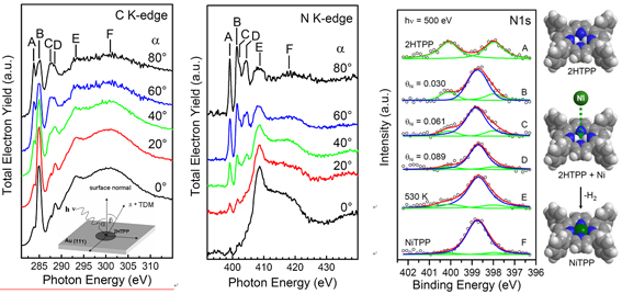 图2 逐步调变入射光角度时多层2HTPP薄膜(~7个单层)的碳的K边(a)和氮的K边(b)的NEXAFS谱以及超高真空环境下2HTPP与金属Ni原位络合生成NiTPP的系列N 1s谱(c).