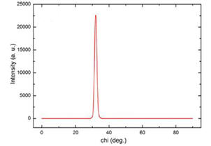 高分辨XRD是在北京同步辐射装置1W1A-漫散射实验站上测试的。对m面InN的纳米棒进行chi扫描,X射线入射方向在薄膜面内为c向,样品沿c轴旋转,从图看出:在32°的位置有一个很强的峰,指出:m面的纳米棒和薄膜间的平行性是很好的。所以,衬底和纳米棒间的倾斜角是32°,也就是说纳米棒有跟a面InN薄膜一样的晶体取向。