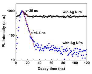 图1 在北京同步辐射装置4B8-真空外实验站测得的时间分辨光荧光谱。结果显示插入Ag纳米颗粒后,弛豫时间由25ns大幅下降为约6.4ns。