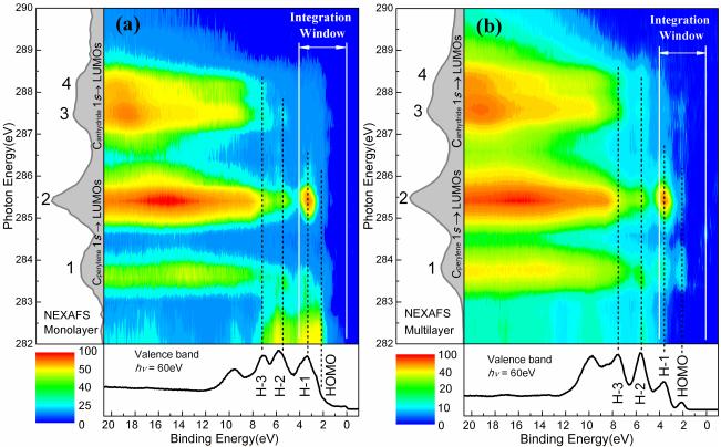 图2 单层(a)和多层(b)PTCDA薄膜在Au(111)表面的二维RPES谱。最下面的谱图为相应的价带谱,激发能量为60 eV,左侧的图谱为相应的NEXAFS谱。一般情况下,多层膜时,界面电荷传输可以忽略,因为分子与衬底作用很弱,因此能观察到较强的共振峰结构(如图2b虚线所示);单层膜时,相应的共振结构会由于界面受激电子到衬底导带的传输过程而减弱甚至消失。但是对于PTCDA/Au(111)体系,单层膜时仍能看到较强的共振峰结构(图2a),这说明受激电子并没有转移到衬底导带。