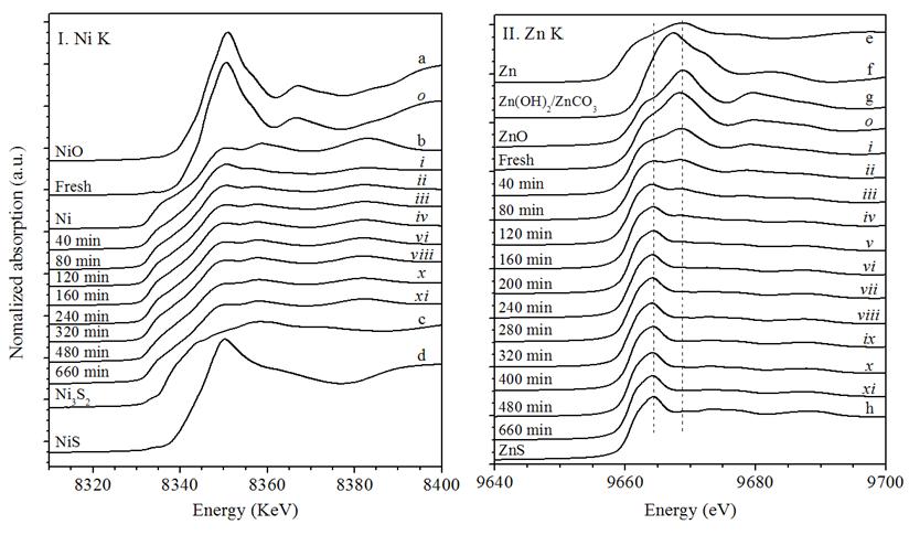 图1(I)显示,反应40分钟后,吸收边峰强度降低,谱图与金属Ni相似,说明还原性反应气氛下NiO很快转化为金属Ni。整个反应过程中,金属Ni是主要的物相,即使反应660分钟后,体相Ni3S2也很难形成,说明在目前反应气氛下金属Ni的完全硫化比较困难。图1(II)显示,在反应过程中Zn的化学态发生了变化;随反应时间延长,吸附剂中归属于ZnO的主峰强度降低,归属于ZnS的边锋强度增加。