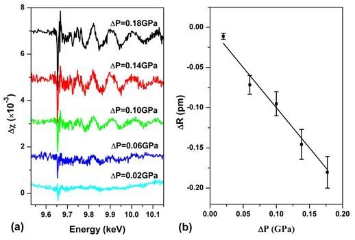 其次,在动态DAC调制系统的基础上,发展了全新的高压调制XAFS实验方法。从实验装置、测量方法到数据分析,我们较为完整地建立了这一方法。利用该方法,我们已经测量到0.001Å的原子位移变化,比传统的EXAFS精度提高了一个数量级(图2)。