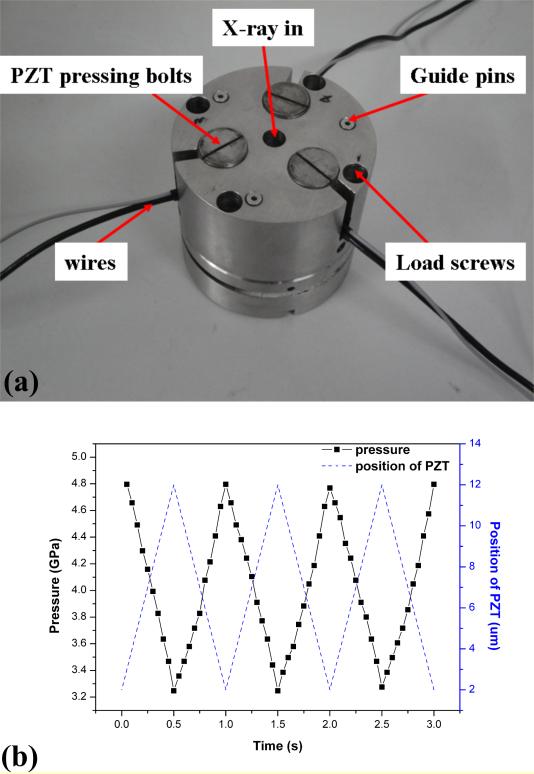 图1 (a)压力调制DAC装置和(b)压腔内的压强变化测试