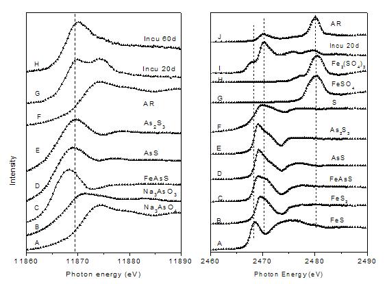 采用同步辐射装置表征元素的微观形态能够看到更加确切的元素转化过程。本研究分别利用北京同步辐射装置(BSRF)和合肥国家同步辐射实验中心(NSRF)获得了微生物作用过程中下硫元素和砷元素的形态转化过程,并确定了硫元素是以低价混合价态的S(0),S(-I),S(-II)的矿物为主,砷主要为类似As2S3的矿物形态而存在。