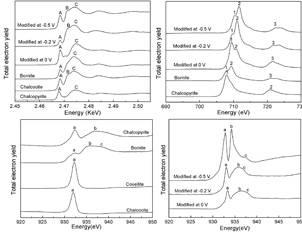 黄铜矿电极在0、-0.2和-0.5V下恒压还原4分钟后电极表面的铜和铁的L3-边和硫的K-边近边结构光谱证实了黄铜矿还原生成斑铜矿和辉铜矿,并且给出了黄铜矿还原生成所对应的电势条件。
