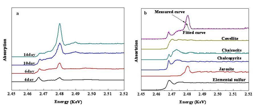 图1 利用北京同步辐射装置4B7A-中能实验站获得的混合嗜酸热古菌浸出黄铜矿过程中硫的K边XANES光谱:在图a中,除了黄铜矿特征峰之外,在2.4804KeV处显示了一个新的硫酸根离子峰,并且随着时间变化,两个峰成明显的消长关系。黄铜矿在浸出第六天时的X射线吸收近边结构拟合结果显示,中间产物主要包括黄铜矿、黄钾铁矾、铜蓝和辉铜矿,它们所占比例分别为47.5%, 38.2%, 13.5% and 0.7%(Fig.b)。