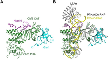 图1酵母H/ACA Cbf5-Nop10-Gar1复合物的晶体结构,以及和古细菌H/ACA RNP的结构比对。
