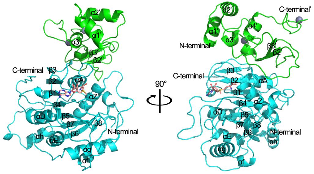 武汉大学研究组之前的工作揭示了nsp16行使甲基转移酶活性需要nsp10的帮助,在这之中,nsp10可能起到了促进因子的作用。现在,他们证明了nsp10可以帮助nsp16结合S-腺苷甲硫氨酸和底物RNA。同时通过与南开大学的合作,课题组获得了nsp16和nsp10蛋白质复合物的晶体结构。Nsp16有7个平行的β折叠片层被柔性片段和α螺旋包围,这是一类甲基转移酶保守的机构域。但是nsp16和其他能独立行使活性的甲基转移酶有一个明显的区别,那就是nsp16的αD螺旋相对比较短,这一特性导致nsp16表面和SAM结合的口袋的柔性增强,不利于SAM和nsp16结合。Nsp10的第93位赖氨酸和nsp16的第105位丝氨酸之前形成了一对氢键,同时nsp10的第80位组氨酸和第102位天冬氨酸之前形成了两对盐桥,nsp10通过这些相互作用稳定了nsp16与SAM结合的口袋,因而促进了nsp16和底物SAM的结合。