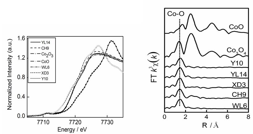 图1 (左). 景德镇官窑青花瓷蓝彩中Co-K边的XANES谱;(右). 景德镇官窑青花瓷蓝彩中Co原子的径向结构函数