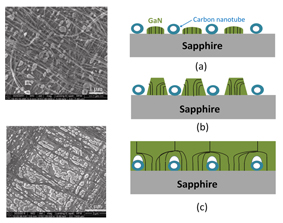 图1:在碳纳米管图形化衬底上的GaN成核情况和生长中位错行为示意图