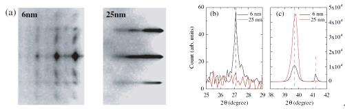 图1(a) RHEED 6纳米和25纳米样品的RHEED图,电子沿[11-2]方向入射. (b),(c) 掠入射X射线衍射谱