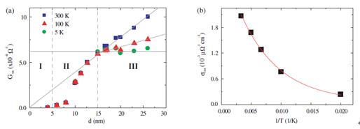 图2 (a) 电导在 300 K, 100 K, 5 K 下随厚度的变化关系;(b) 15纳米以上样品电导随厚度变化的斜率对温度作图,红线是对其做的e指数拟合。