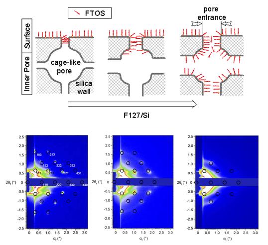 利用北京同步辐射装置(BSRF)GISAXS实验技术解析了有序介孔薄膜的结构以及改变制备工艺时薄膜的结构演变。在本体系中,当表面活性剂与硅源的摩尔比为0.005时,薄膜为体心立方结构,增大表面活性剂含量,薄膜的结构得到保持但有序性下降。