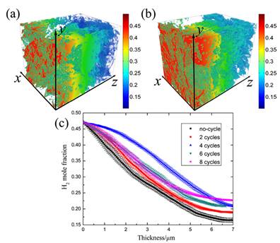 利用三维重构数据及模拟得到的H2和H2O的摩尔分数,我们计算了各阳极内部的浓差极化和活化极化,结果表明:随着热循环次数的增加,浓差极化的值反而变小,这是由于未发生热循环的阳极内H2和H2O的摩尔分数变化最剧烈。活化极化和三相界面密度成反比关系,所以随着热循环次数的增加,三相界面密度变小,活化极化值逐渐增大。基于三维重构数据,建立气体传输反应模型模拟了气体的传输及电化学反应过程,得到的结果更能真实反映电池运行过程中气体扩散反应的详细过程,为优化电池性能提供理论数据。