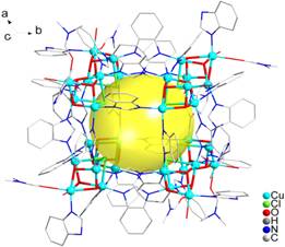 1 配合物三十二核阳离子簇示意图,为了视图清晰氢原子被省略。图中黄球为直径约为9 Å的大孔洞,大立方体的顶点被八个小立方体[Cu4O3Cl]所占据。