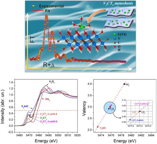 为了进一步研究V2CTx与铀酰离子的相互作用机理,该研究组利用同步辐射技术对铀原子周围的配位结构信息进行解析,扩展X射线吸收精细结构谱(EXAFS)结果表明铀酰离子与该片层材料钒活性位点上的两个羟基结合形成了稳定的二齿配合物,从而实现对UVI)快速高效吸附。同时利用第一性原理建立模型进行理论计算,得到V2CTx-U配合物的能量最优构象和配位模式均与EXAFS结果保持一致。此外,还通过X射线吸收近边结构光谱(XANES)对V2CTx以及母体材料V2AlCV的价态进行了估算。
