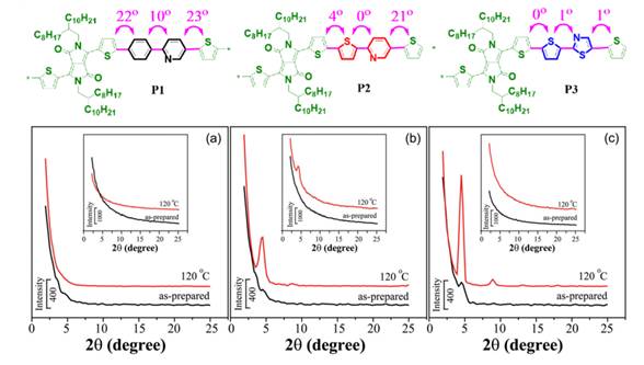 利用北京同步辐射装置(BSRF1W1A-漫散射实验站他们对聚合物在硅基衬底上的分子排布进行了研究。结果表明,聚合物P3表现出edge-on的分子排列方式,且具有尖锐的信号峰,体现出较好结晶性。而其他聚合物信号较弱,甚至无明显的信号,表现出较差的结晶性甚至呈现无定形堆积。这与聚合物的半导体性能相匹配。这说明柔性侧链的引入可调控分子的排列方式,从而影响聚合物分子的半导体性能。这一研究体现了刚性共轭骨架的平面性对半导体性能的影响。