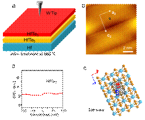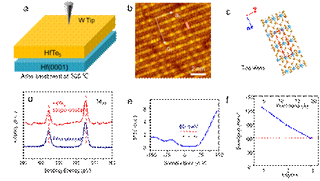 图4 Hf(0001)面上制备的三碲化铪-五碲化铪叠层材料。(a)示意图: 样品在560 ℃下退火,使得处于最顶部的五碲化铪变为三碲化铪膜。(b,c)原子分辨STM图像及对应的模型。(d)制备的三碲化铪的隧道电流微分谱,没有能隙。