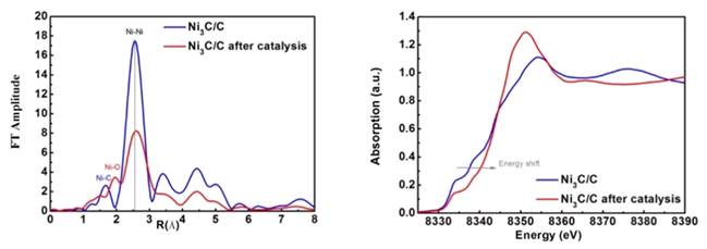 利用北京同步辐射装置(BSRF)1W1B-XAFS实验站的X射线吸收谱学技术,研究人员对材料催化前后的X 射线吸收精细结构光谱(XAFS)进行了测量分析,近边吸收X 射线吸收精细结构光谱(NEXAFS)发现催化过后的样品近边往高能方向明显移动,说明Ni的价态在催化后升高。此外,外延吸收谱分析表明催化过后有Ni-O键产生,而Ni-Ni键强度明显降低,并且键长有所增加,同时综合HRTEM、元素分布像(EELS-Mapping) 等表征手段,确定催化后Ni3C上原位生成了NiOX层,而其应为析氧催化反应实际的反应位点。此工作揭示了非金属氧化物催化剂的催化机制,为设计高效催化剂开辟了新思路。