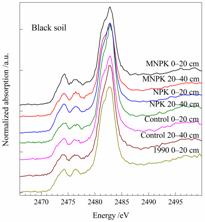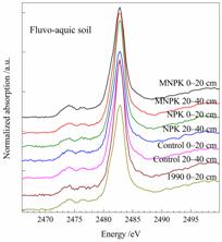 硫素同步辐射XANES分析是在北京同步辐射装置(BSRF4B7A-中能实验站进行的。土壤样品(包括新鲜含水湿样)采用2.5 μm Mylar膜包裹,在氦气环境中直接测定XANES谱图。通过XANES分析考察不同施肥处理:空白对照、历史对照(1990年样品)、施用无机肥、施用有机无机肥等处理对土壤硫素形态分布与转化的影响特征,研究组认为长期施用有机肥可以促进还原态及中间价态有机硫在土壤中的累积,从而增加土壤有机硫及全硫含量。同时研究发现,化学分组提取方法会造成部分有机硫水解、转化成无机硫,从而导致土壤无机硫的组分分析结果偏高。研究结果对于从分子水平认识硫素在我国农田土壤赋存形态及其地球化学循环具有重要意义。