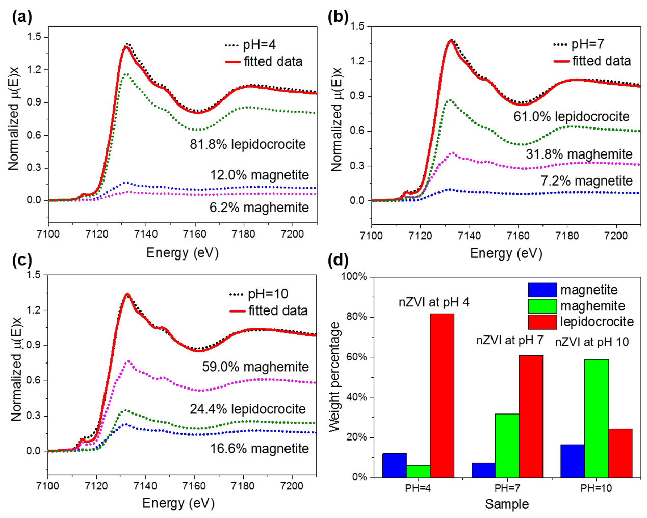 利用北京同步辐射装置(BSRF)X射线吸收谱技术获得的吸附As(V)后的nZVI样品Fe的K边XANES图谱以及LCF结果。在初始pH为4时,nZVI的腐蚀产物主要为纤铁矿(γ-FeOOH),还含有少量的磁铁矿(Fe3O4)和磁赤铁矿(γ-Fe2O3)。而初始pH为7时,腐蚀产物中γ-FeOOH、Fe3O4和γ-Fe2O3的含量分别为61.0%、7.2%和31.8%。初始pH为10时,腐蚀产物中γ–FeOOH、Fe3O4和γ-Fe2O3的含量分别为24.4%、16.6%和59.0%。随着pH的增加,γ-FeOOH的含量显著下降,由81.8%下降到24.4%;而Fe3O4/γ-Fe2O3的含量则急剧上升,由18.2%上升到75.4%。而不同的铁(氢)氧化物对As(V)的吸附能力不同。