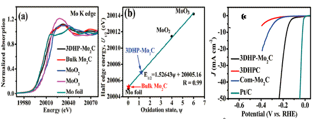 1 (a)碳化钼的同步辐射精细吸收谱和(b)对应的半波能量和钼氧化态之间的关系;(c) 碳化钼催化剂电催化析氢极化曲线
