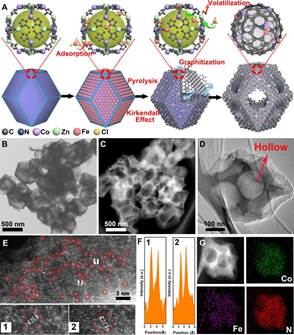 吴宇恩教授课题组,以锌钴双金属MOF作为前驱体,通过双溶剂法吸附铁盐,在高温环境下,Fe 3+被周围石墨化的C逐渐还原并与邻近的Co成键,从而形成Fe,Co双金属活性位点。同时,Fe催化载体生成氮掺杂的石墨化碳,并分解释放C和N的碎片,加速金属-咪唑-金属键的断裂,从而迫使MOF内产生空隙。最终在Kirkedall的作用下形成了空洞结构。