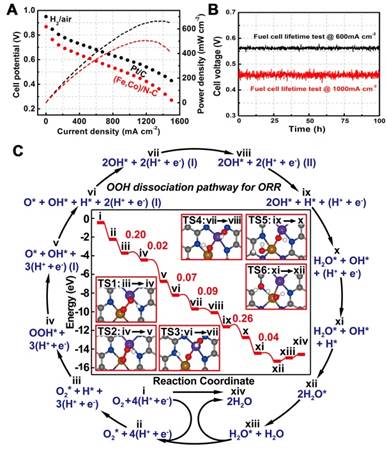 通过北京同步辐射装置(BSRF)1W1B线站的XAFS、球差电镜、穆斯堡尔谱等多种手段表征了该双原子材料是Fe,Co成键并与周围N配位的结构。通过理论计算表明Fe-Co键的存在更有利于O-O键的断裂,该结构使得催化剂在氧还原反应中有很高的活性。在酸性氧还原反应中表现出半波电位为0.863 V, 起始电位为1.06 V, 且0.9 V 下的电流密度为2.842 mA cm-2, 并稳定循环5万圈的优异性能。在氢氧燃料电池中最高输出功率高达0.98 W cm-2。在氢空燃料电池中最高输出功率0.51 W cm-2并稳定运行100小时以上。是目前已报道非Pt催化剂中,该双原子材料的氢空燃料电池的性能最高,并将已有的最高活性提高20 %。