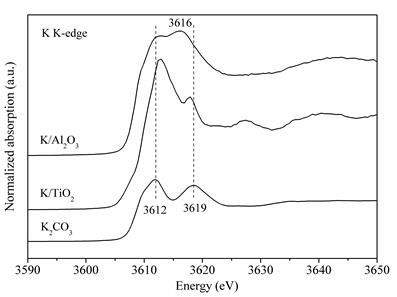 利用北京同步辐射装置(BSRF)4B7A-中能实验站获得的K/Al2O3, K/TiO2和K2CO3的K的K边的归一化吸收谱图。对于K/Al2O3,吸收峰的位置与K2CO3的相近,表明在K/Al2O3中存在K的碳酸盐物种,除此以外,在3616 eV处出现了一个新峰,表明K的配位状态受到了Al的影响,结合XRD结果,将其归因于K2Al2O4的生成。而对于K/TiO2,呈现出了与K2CO3完全不同的EXAFS吸收峰,3612 eV处的峰向高能方向移动,而3619 eV处的峰向低能方向移动,表明在K/TiO2中,形成了一种新的K的相,根据XRD结果,新相为K2Ti6O13。