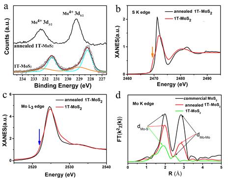 图1 (a)所制备的1T-MoS2和退火后的1T-MoS2样品(转化为2H相)的Mo 3d轨道的XPS能谱图。退火后的1T-MoS2和所制备的1T-MoS2(b)S K-edge和(c)Mo-L3-近边XANES的比较。(d)Mo K边的傅里叶变换曲线。